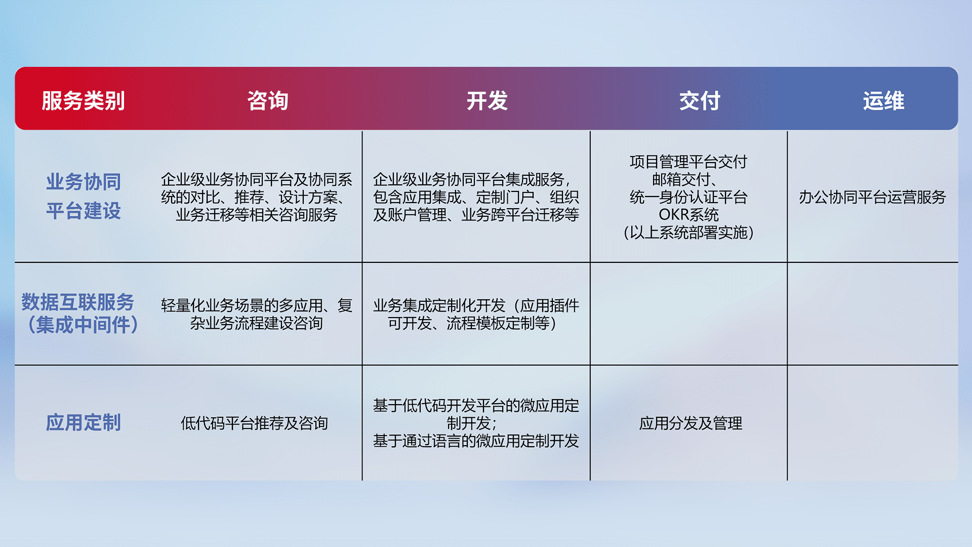 针对钉钉、、、企微、、、、IDaas等平台级产品提供产品的规划、、、、方案、、交付、、、定制化开发等服务,,,实现如统一协同办公、、、智能客户服务、、混合会议管理、、、智能数据查询、、等业务场景,,,实现数字化转型。。。